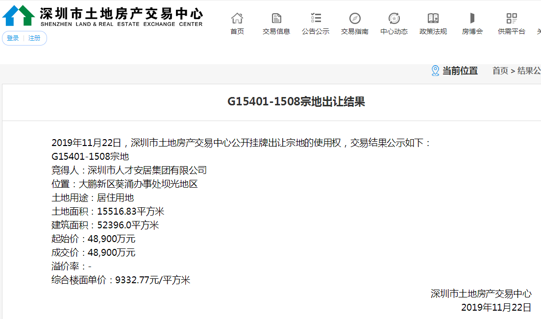 見圳客戶端·深圳新聞網(wǎng)2019年11月27日訊 記者從深圳政府在線網(wǎng)站了解到,11月22日下午,深圳市首宗出售型人才住房用地--G15401-1508宗地即大鵬新區(qū)壩光03-08地塊,被深圳市人才安居集團(tuán)以總價(jià)4.89億元成功競得。
