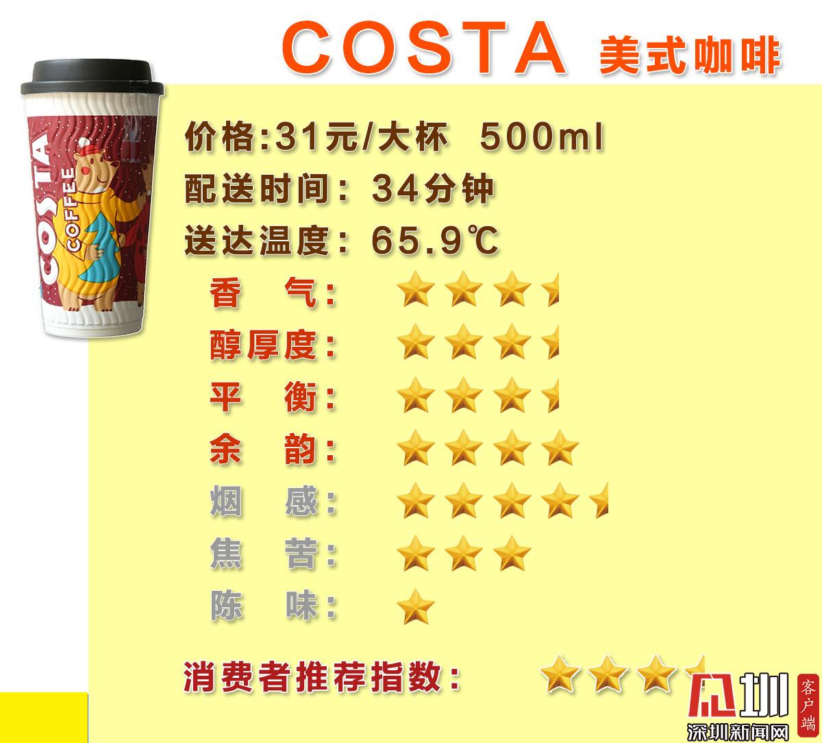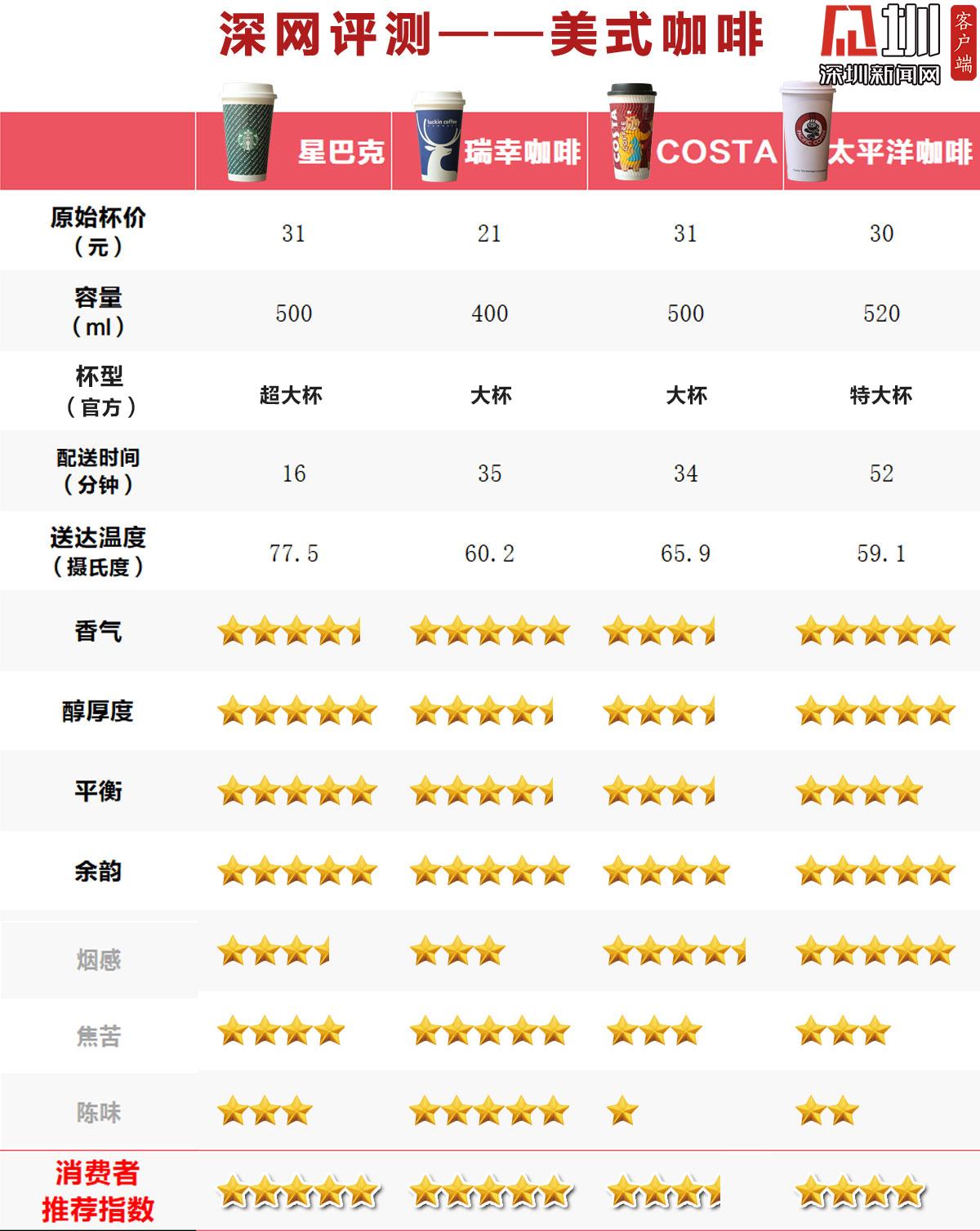 綜合“美式(熱)”咖啡主觀評(píng)測(cè)的4個(gè)正值評(píng)分(香氣、醇厚感、平衡度、余韻)以及3個(gè)負(fù)值評(píng)分(煙感、焦苦、陳味),最終星巴克在消費(fèi)者推薦指數(shù)評(píng)分中脫穎而出收獲5星好評(píng),瑞幸咖啡與太平洋咖啡分別獲得4星好評(píng),出乎意料的是Costa咖啡僅獲得3星評(píng)價(jià),在參與測(cè)評(píng)的20位消費(fèi)者中口碑較差。