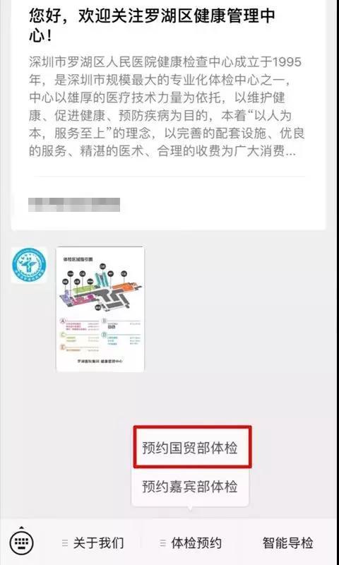 首先,關(guān)注公眾號(hào)“羅湖醫(yī)院集團(tuán)健康管理中心”,進(jìn)入公眾號(hào)點(diǎn)擊菜單欄“預(yù)約國(guó)貿(mào)部體檢”。