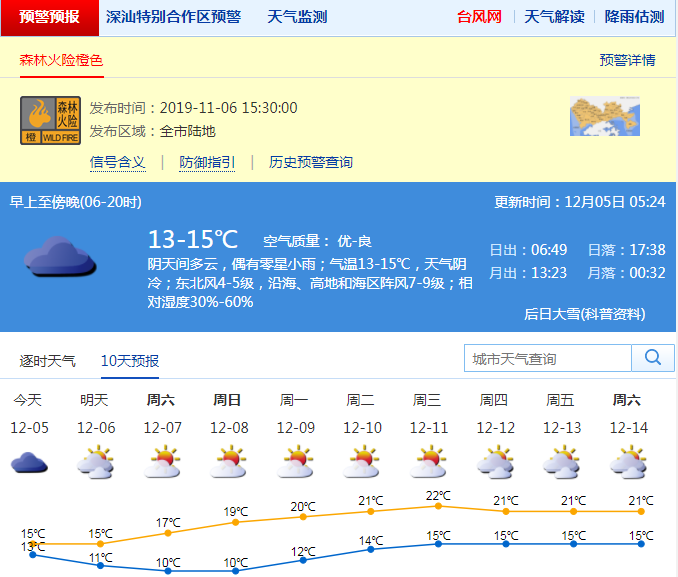 全市森林火險(xiǎn)橙色預(yù)警信號(hào)生效中,其中深汕區(qū)森林火險(xiǎn)紅色預(yù)警和寒冷黃色預(yù)警信號(hào)生效中。