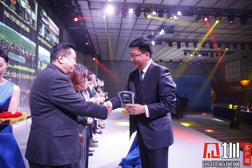 深圳報(bào)業(yè)集團(tuán)社長(zhǎng)助理、深新傳媒董事長(zhǎng)吉書(shū)龍為榮獲“年度公益先鋒力量”的單位代表頒獎(jiǎng)。