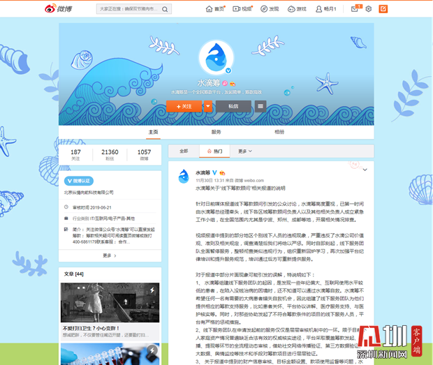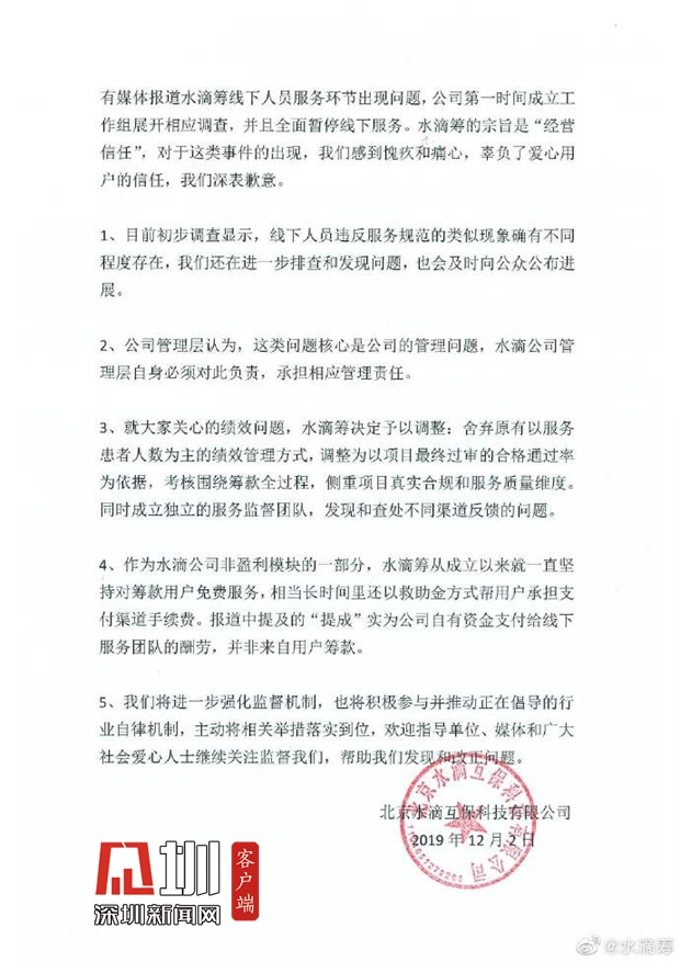 見圳客戶端.深圳新聞網(wǎng)2019年12月6日訊(見圳客戶端、深圳新聞網(wǎng)記者 張玲)2019年11月30日,據(jù)梨視頻報道,互聯(lián)網(wǎng)籌款平臺“水滴籌”在超過40個城市的醫(yī)院派駐地推人員,線下地推服務(wù)人員被指在醫(yī)院“掃樓”尋找求助者,套用模板,隨意填寫金額,不審核甚至隱瞞求助者財產(chǎn)狀況,鼓勵患者大量轉(zhuǎn)發(fā)籌款信息。同日,水滴籌通過微博官方認證公眾號回應(yīng)稱,已第一時間成立緊急工作小組開展相關(guān)情況排查,同時線下服務(wù)團隊全面暫停服務(wù),整頓徹查類似違規(guī)行為,并對梨視頻報道可能引發(fā)的誤解進行了3點說明。