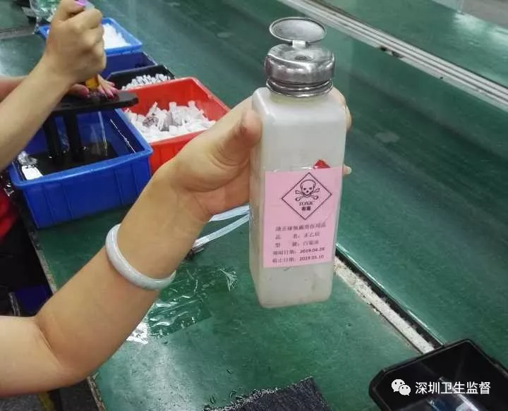 檢查過程中發(fā)現(xiàn)該公司A棟2樓水箱車間,可見組裝線組裝崗位工人韋某正在使用白電油(成分顯示為正己烷)作業(yè),未見佩戴防護(hù)指套。