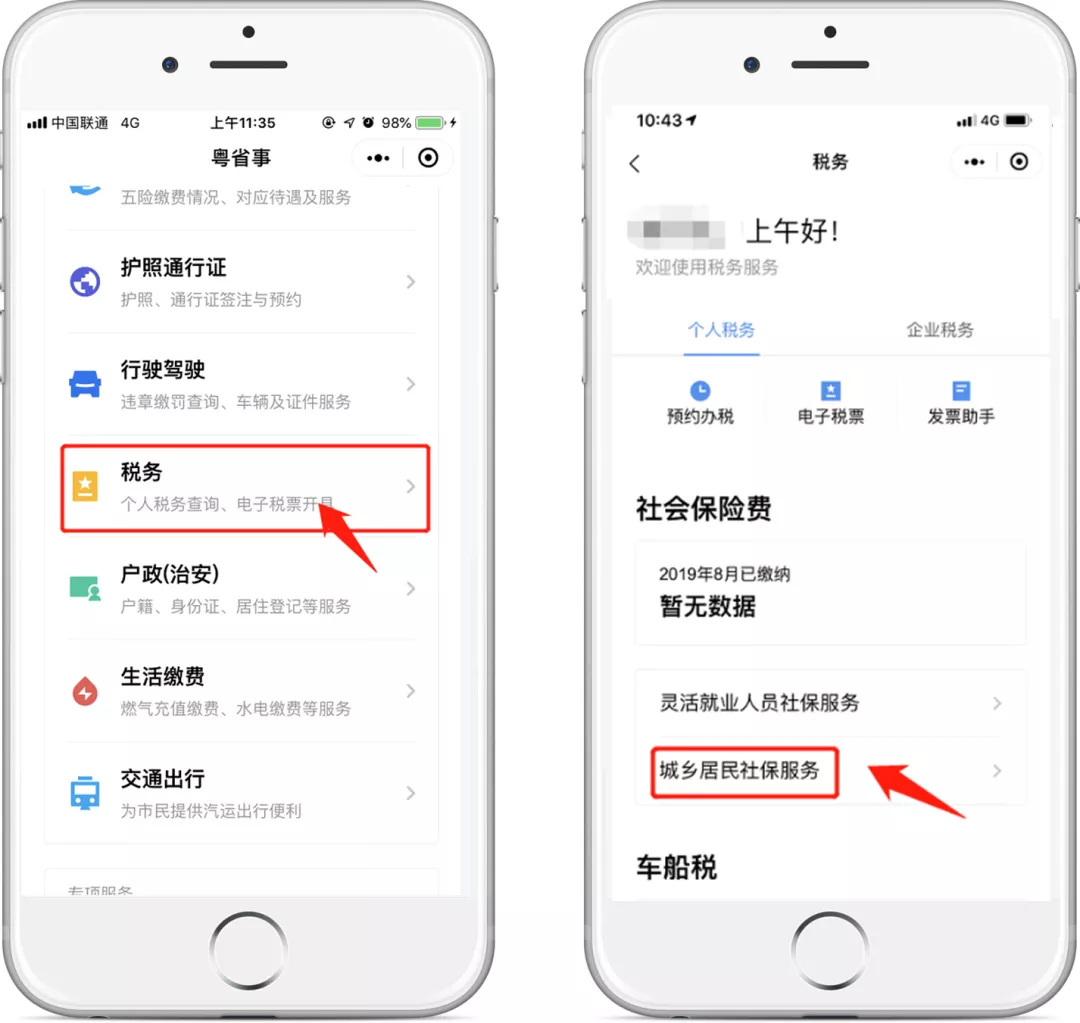 在“粵省事”小程序首頁點擊“稅務(wù)”服務(wù),在“個人稅務(wù)”板塊找到“社會保險費”—“城鄉(xiāng)居民社保服務(wù)”(暫不支持深圳地區(qū))。