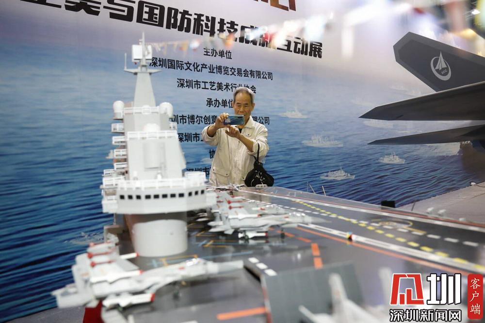 一位市民正在拍照,該模型為“遼寧號”航母模型。