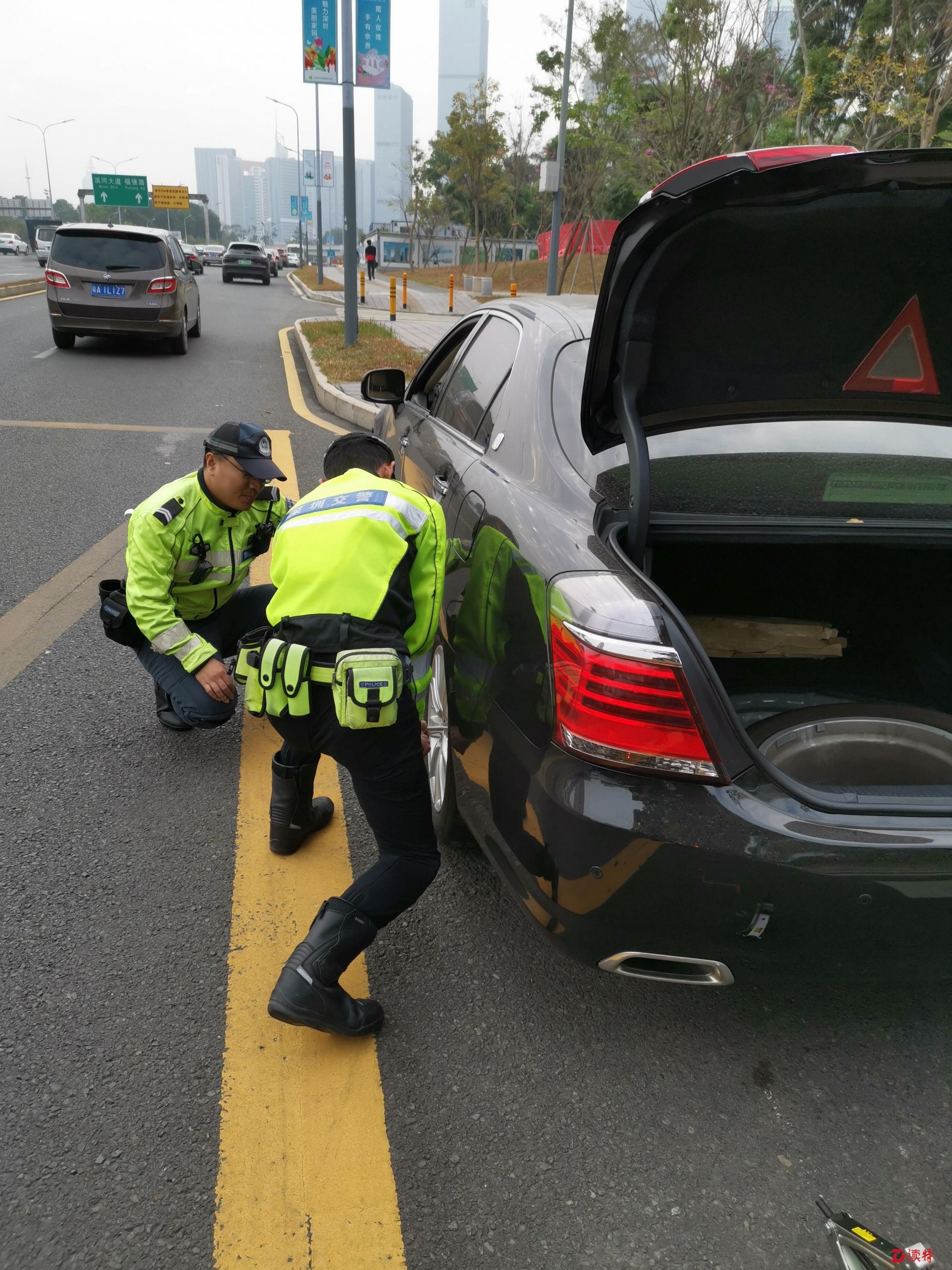 正當(dāng)記者心急如焚且束手無策之時,在路上巡查的福田交通大隊(duì)香蜜湖中隊(duì)鐵騎鄭彬銳警官途經(jīng)此地,見狀他立即停住鐵騎,上前詢問情況。當(dāng)他看到車輛左側(cè)兩輪均癟下時,立即問記者是否有備胎,同時讓記者趕緊聯(lián)系車行再送一個備胎過來。