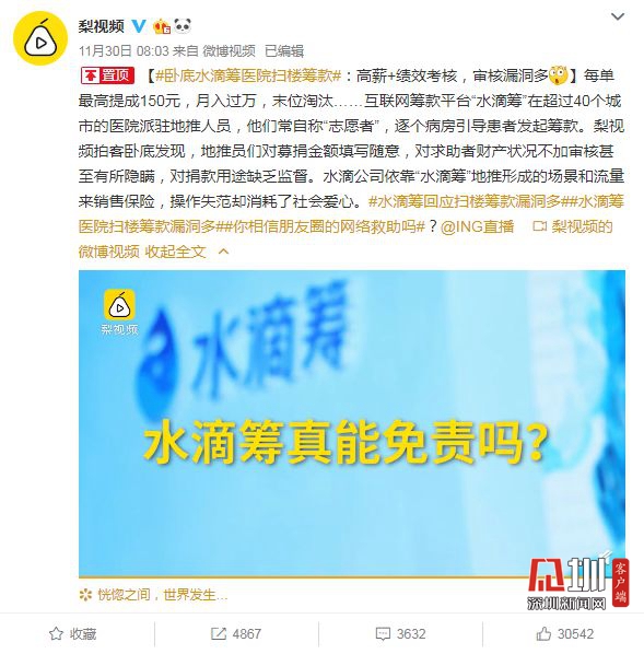最早曝光水滴籌醫(yī)院掃樓籌款的梨視頻頁面截圖。