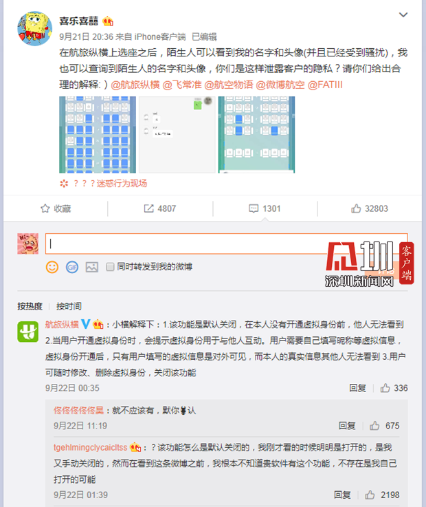 微博網(wǎng)友@喜樂喜囍最早爆出航旅縱橫App默認開啟陌生人社交功能,圖為頁面截圖。