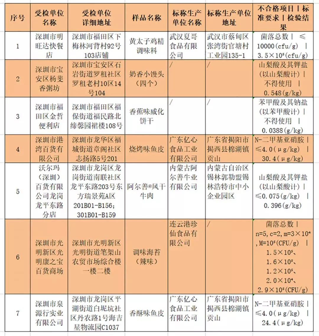 本次共抽檢流通、餐飲環(huán)節(jié)食品844批次,涉及流通、餐飲環(huán)節(jié)經(jīng)營主體256家次,共檢測食品指標(biāo)6187項次。其中檢出不合格樣品7批次,涉及不合格食品類別有餅干1批次,餐飲食品1批次,肉制品1批次,水產(chǎn)制品3批次,調(diào)味品1批次;涉及不合格項目類別為微生物污染、食品添加劑、其他污染物。