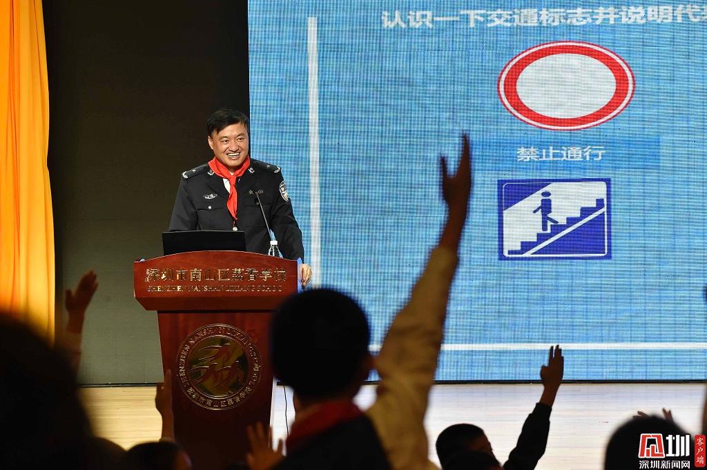 2019年2月20日,南山區(qū)荔香學(xué)校,市交警局局長徐煒正在向?qū)W生們講述交通安全知識。為加強(qiáng)2019年度新學(xué)期校園交通安全宣傳工作,深圳交警聯(lián)合市教育局在新學(xué)期開學(xué)期間,在全市范圍開展“交通安全教育第一課”授課活動(dòng)。