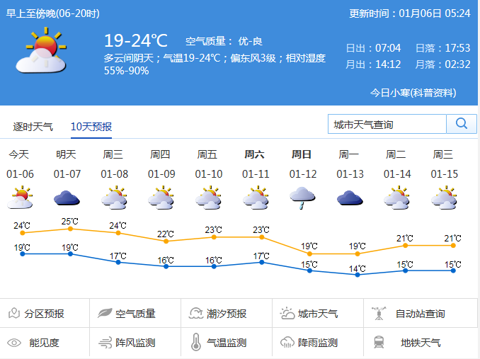 見圳客戶端·深圳新聞網2020年1月6日訊 據深圳市氣象臺消息,預計本周初深圳多云間陰天,早晚有零星小雨和輕霧;周三至周四受弱冷空氣影響,沿海和高地陣風6~7級,早晚清涼;周五至周六多云,氣溫回升,周日受冷空氣影響,氣溫再次下降。