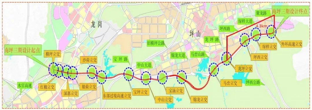 至于沿線立交方面,沿線龍崗大道立交、東部過境立交、中山立交、龍坪立交已開通。坪西立交計(jì)劃近期開通。