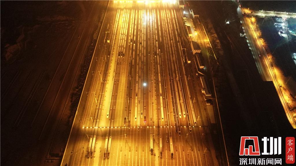 1月15日凌晨,深圳動車運用所內(nèi)的存車庫航拍畫面。