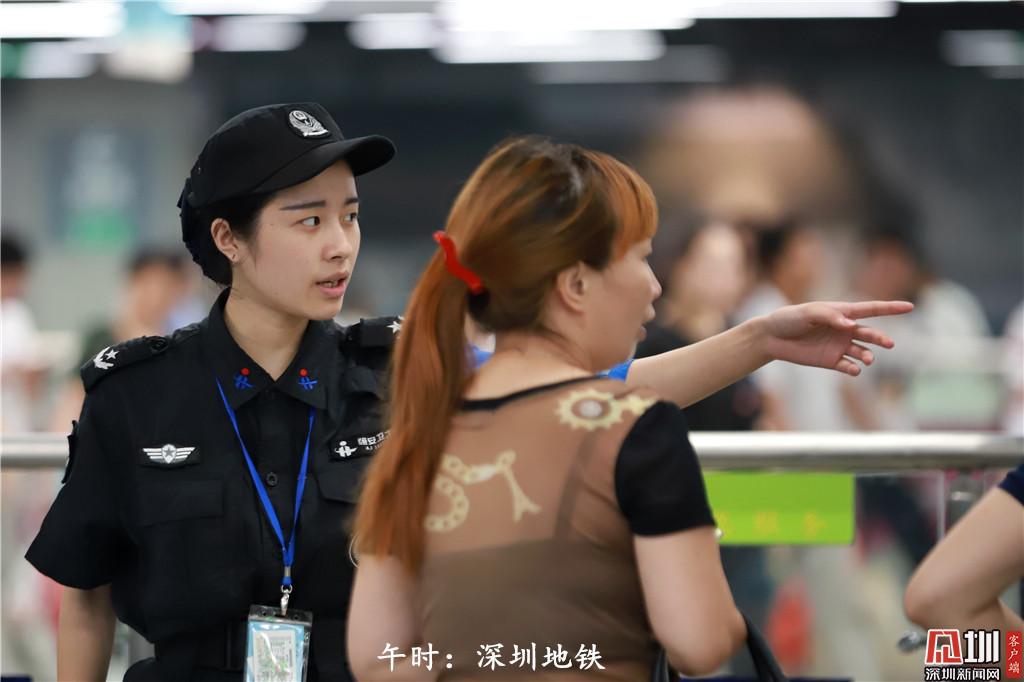 12點56分,深圳地鐵安檢人員謝幗英為乘客指路。