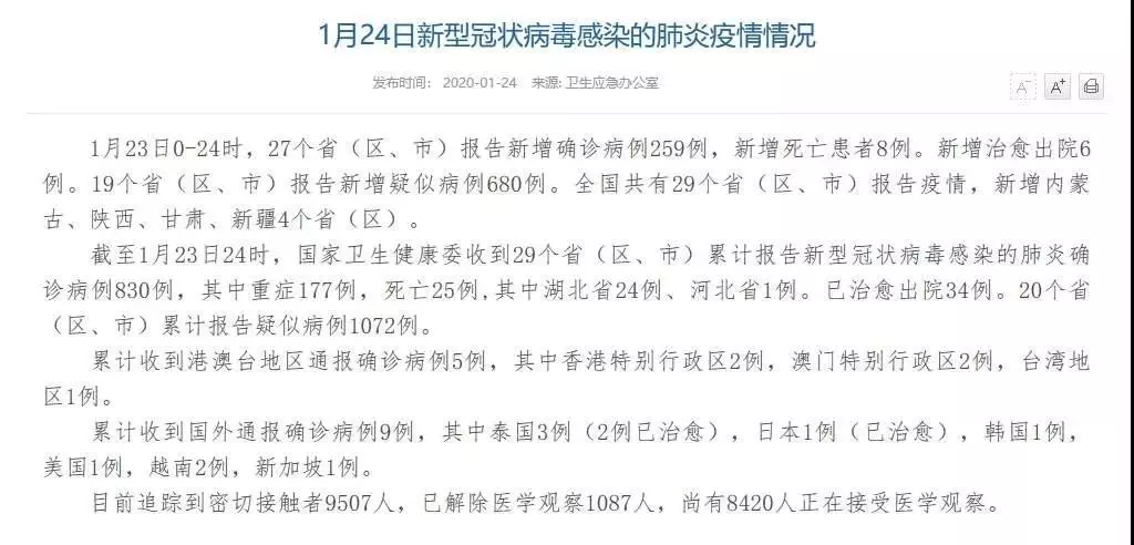 截至1月23日24時,國家衛(wèi)生健康委收到29個?。▍^(qū)、市)累計報告新型冠狀病毒感染的肺炎確診病例830例,其中重癥177例,死亡25例,其中湖北省24例、河北省1例。已治愈出院34例。20個?。▍^(qū)、市)累計報告疑似病例1072例。
