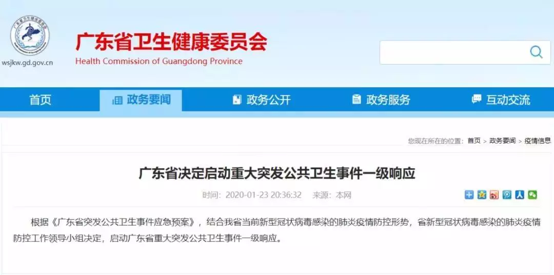 廣東省衛(wèi)健委1月23日晚發(fā)布通告:根據(jù)《廣東省突發(fā)公共衛(wèi)生事件應(yīng)急預案》,結(jié)合我省當前新型冠狀病毒感染的肺炎疫情防控形勢,省新型冠狀病毒感染的肺炎疫情防控工作領(lǐng)導小組決定,啟動廣東省重大突發(fā)公共衛(wèi)生事件一級響應(yīng)。