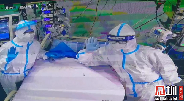 市三院醫(yī)護(hù)人員在感染ICU和大家打招呼,感謝市民朋友的關(guān)心和愛護(hù)。
