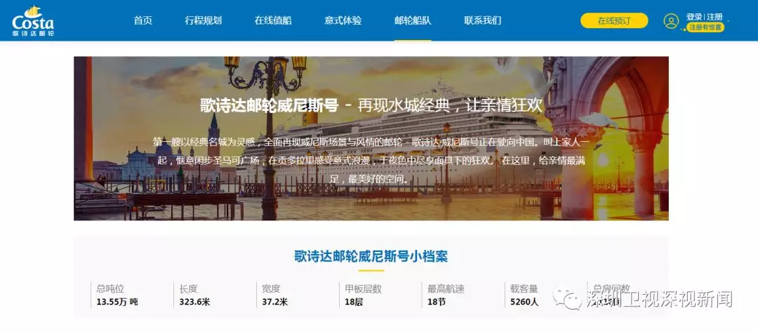 歌詩達(dá)郵輪中國官網(wǎng)顯示,威尼斯號郵輪載客量5260人,共2116個房間。