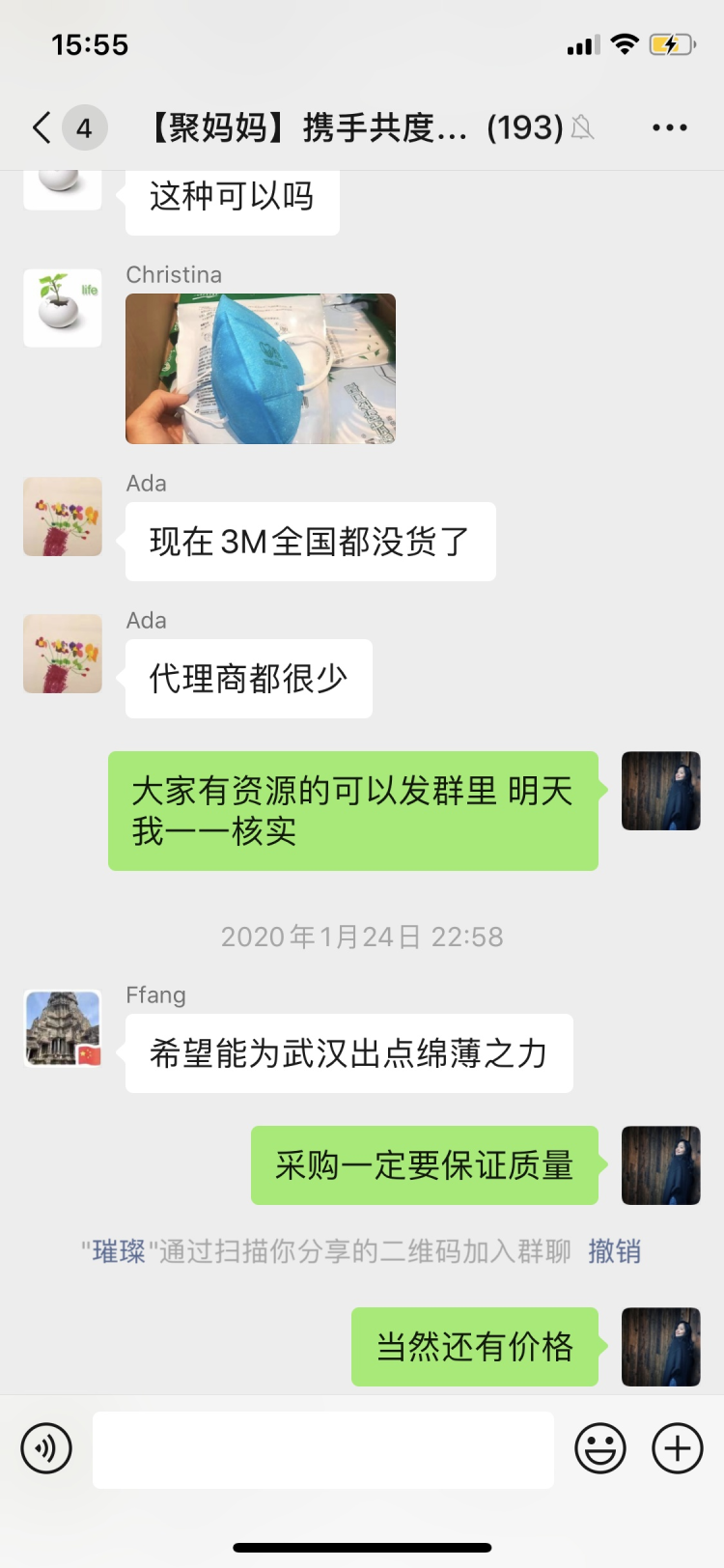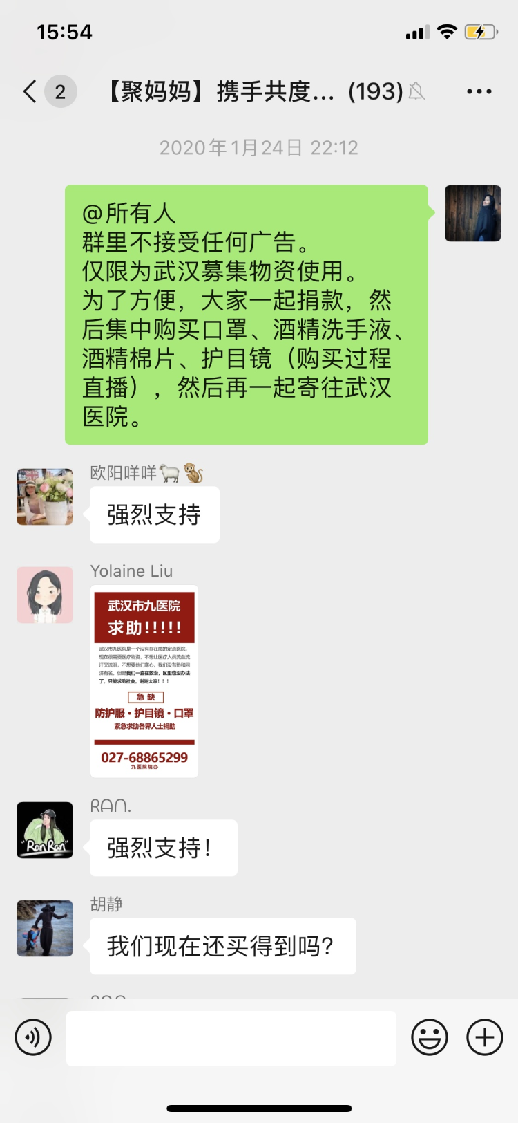 這一百多名媽媽是一個名為“聚媽媽攜手共渡難關”(以下簡稱“聚媽媽”)微信群的成員,Miya是“聚媽媽”的發(fā)起人之一。1月24日除夕那天,Miya與一位朋友聊起疫情,兩人都覺得,醫(yī)院缺物資,一兩人的力量又太單薄,不如發(fā)動朋友們一起購買直接送到醫(yī)院。Miya在當晚9點左右建了這個臨時群,并邀請周圍熟識的朋友加入。