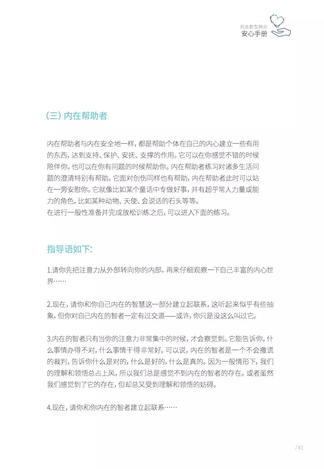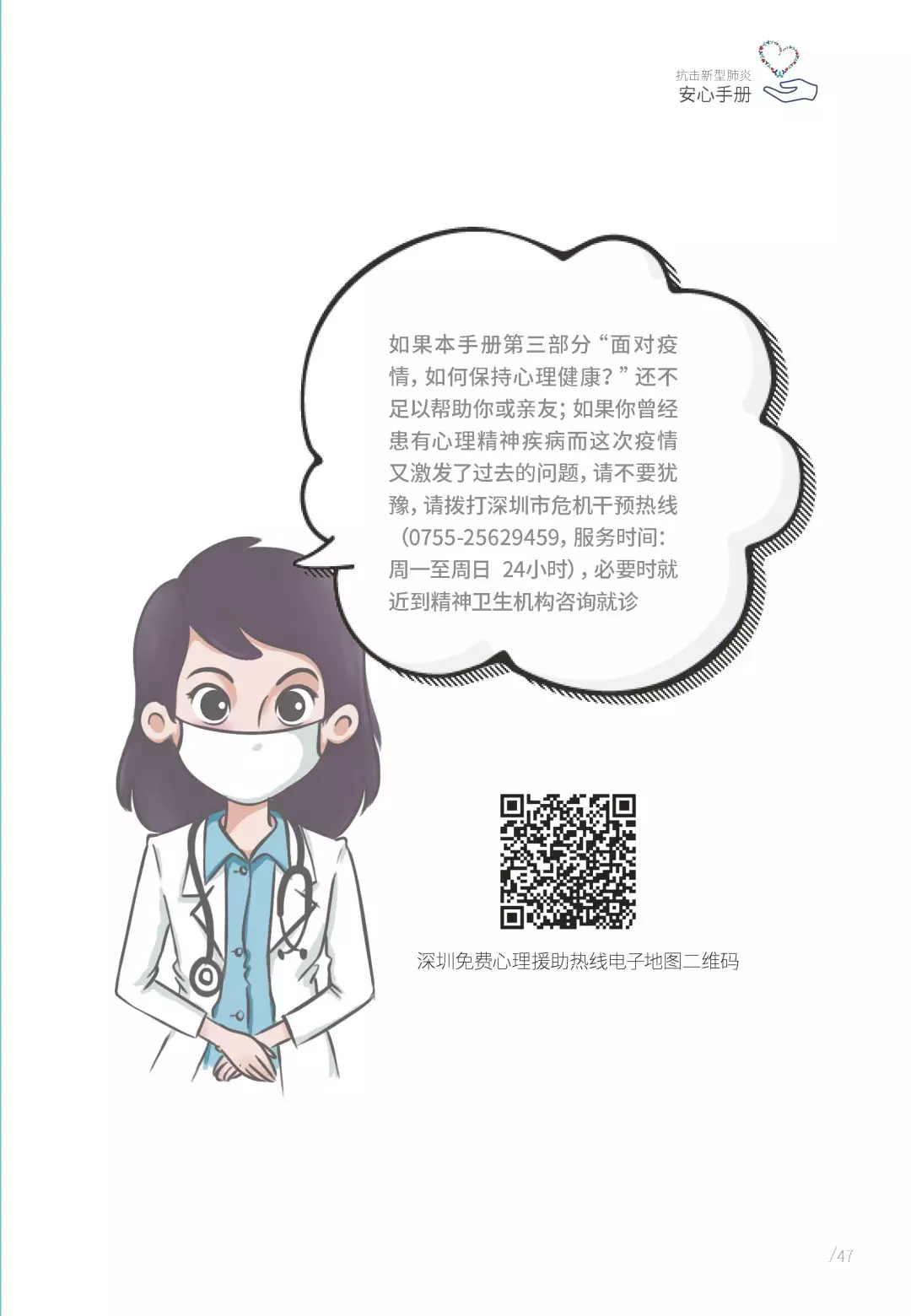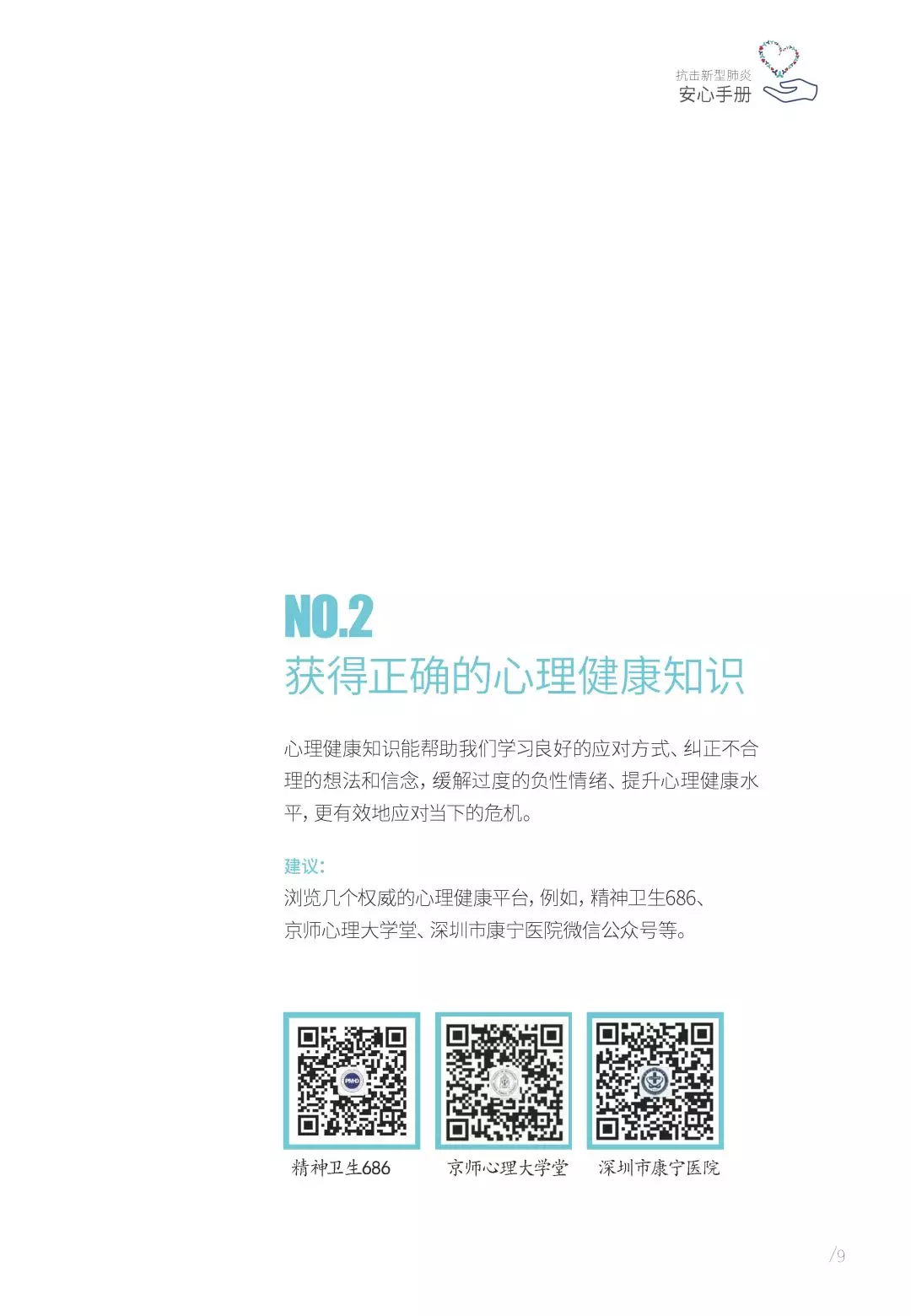 抗擊新型肺炎“安心手冊(cè)”由深圳市精神衛(wèi)生中心/深圳市康寧醫(yī)院支持,深圳市康寧醫(yī)院始建于1980年,是深圳市唯一一家集預(yù)防、醫(yī)療、康復(fù)、科研、教學(xué)于一體的公立三甲精神病專科醫(yī)院。2010年以來,醫(yī)院連續(xù)九年名列復(fù)旦大學(xué)醫(yī)院管理研究所中國(guó)最佳??婆判邪窬駥?漆t(yī)院前十位;2017年榮膺第五屆全國(guó)文明單位;2019年精神科獲評(píng)廣東省高水平臨床重點(diǎn)??啤at(yī)院服務(wù)在各類顧客體驗(yàn)度和公眾滿意度測(cè)評(píng)中,名列前茅。