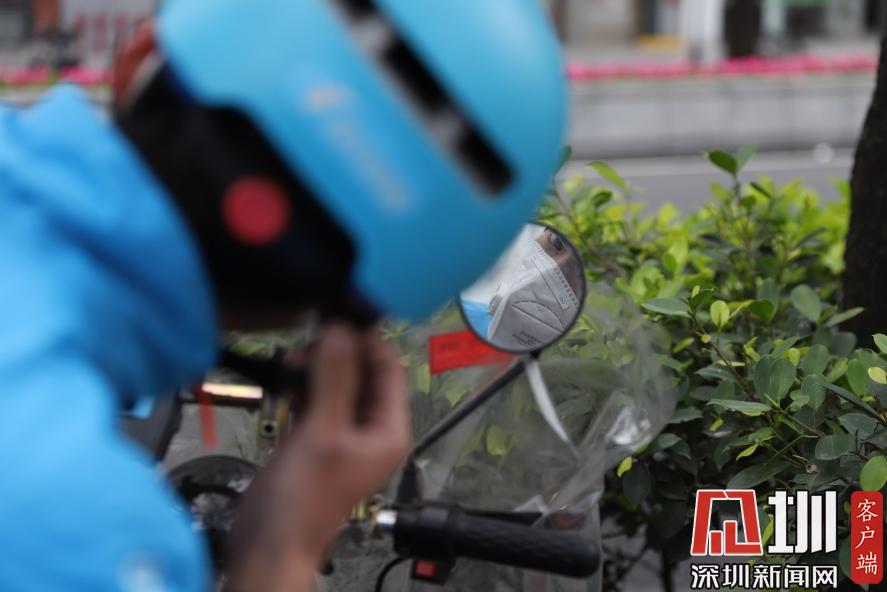 下午2點(diǎn)32分,午休過(guò)后,王彭輝用后視鏡調(diào)整戴好的頭盔,繼續(xù)送餐。