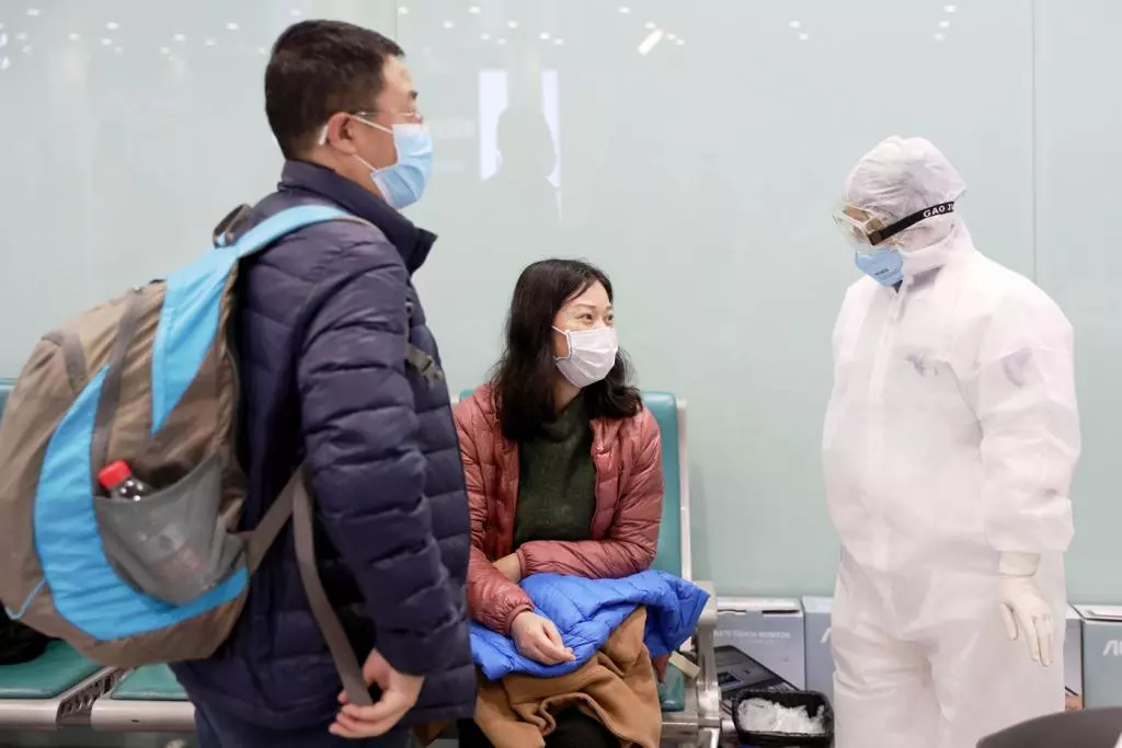 在機場檢疫站旁,醫(yī)務(wù)人員對旅客進行詢問和醫(yī)學(xué)健康篩查。