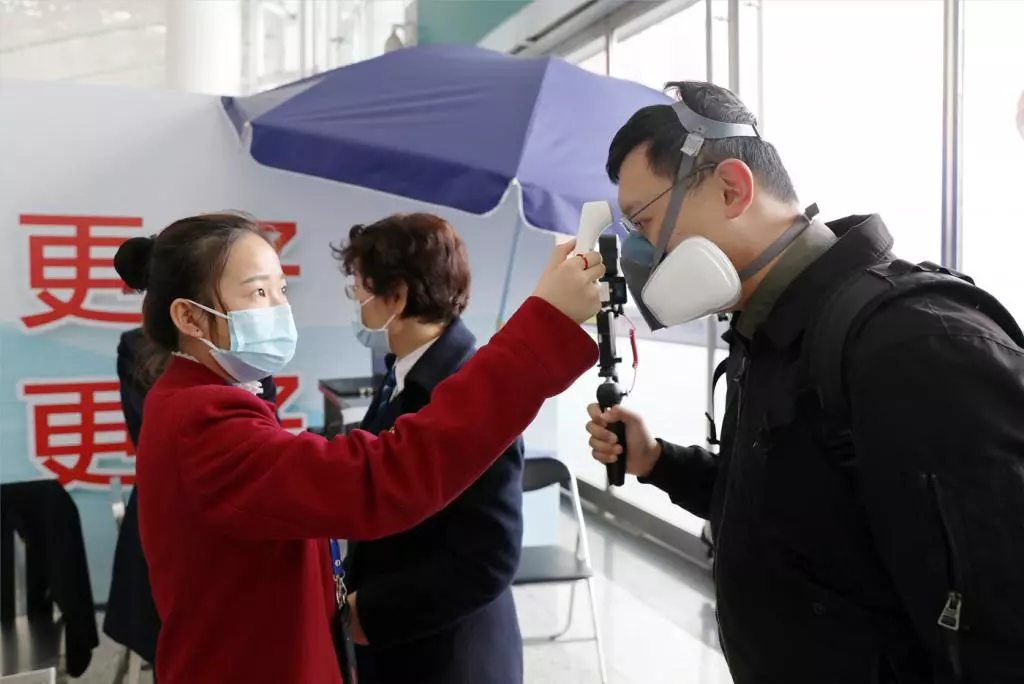 在地鐵站入口處,安檢人員測量乘客體溫。