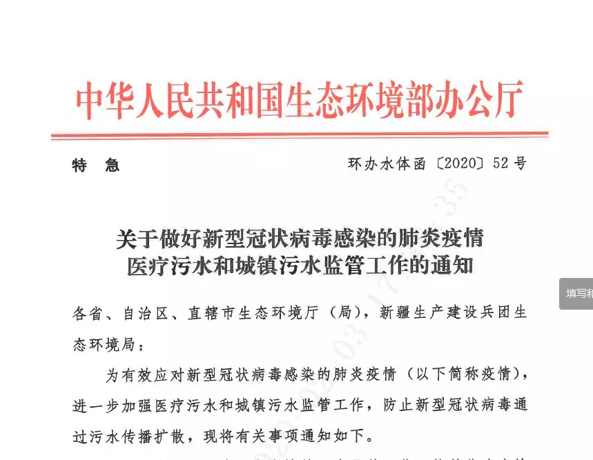 而在2月1號(hào)深夜,生態(tài)環(huán)境部印發(fā)通知,部署醫(yī)療污水和城鎮(zhèn)污水監(jiān)管工作,規(guī)范醫(yī)療污水應(yīng)急處理、殺菌消毒要求,防止新型冠狀病毒通過糞便和污水?dāng)U散傳播。