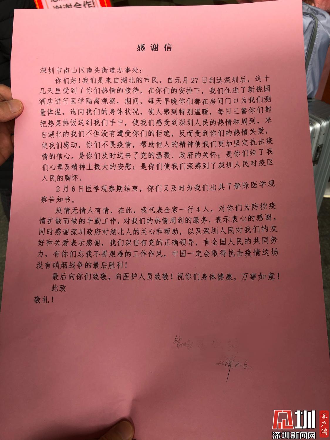 2月6日醫(yī)學(xué)觀察期滿,經(jīng)檢測(cè)他們一家并無(wú)不適癥狀,衛(wèi)健局駐點(diǎn)人員為其出具了解除醫(yī)學(xué)觀察告知書(shū)。李女士拉著行李滿眼淚花說(shuō)道:“深圳各級(jí)政府部門(mén)高效實(shí)干,深圳的工作人員很熱心很細(xì)心,疫情猖獗時(shí),人間自有真情在,真的感謝你們。”