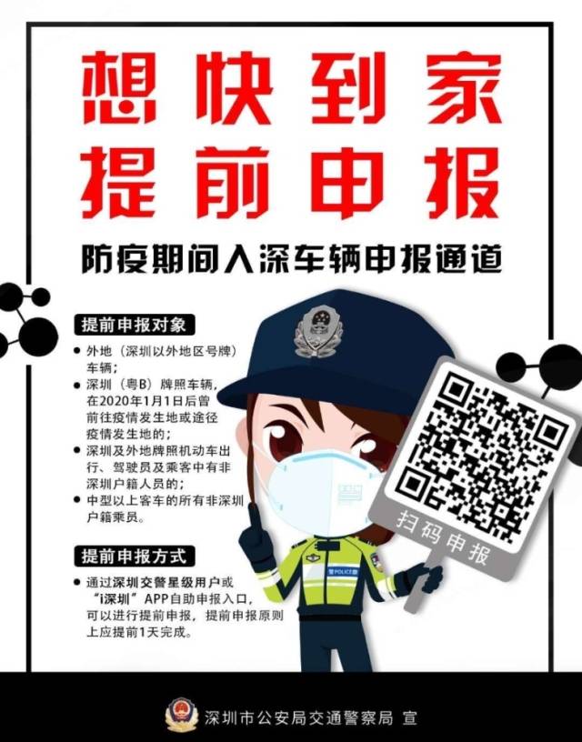 深圳交警提示,預(yù)計返深車流將逐漸增大,為了更快速的通過檢疫點,建議即將返深的車主和廣大市民提前通過網(wǎng)上進行申報。