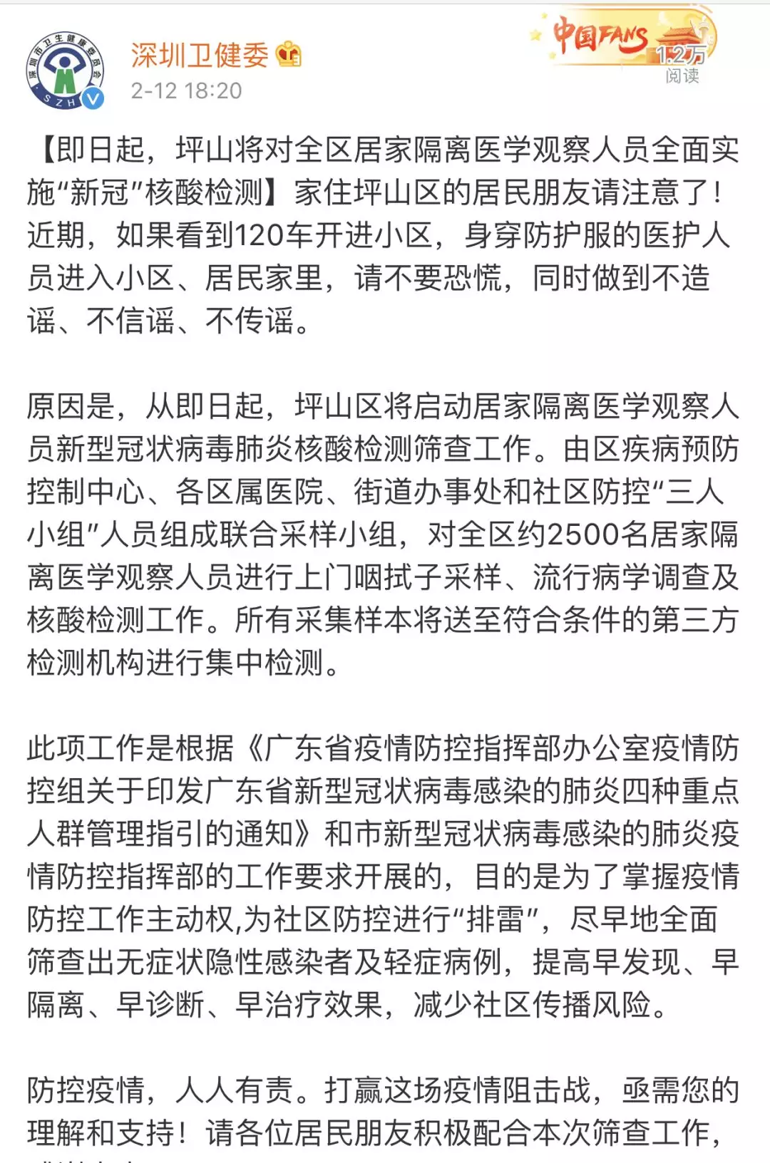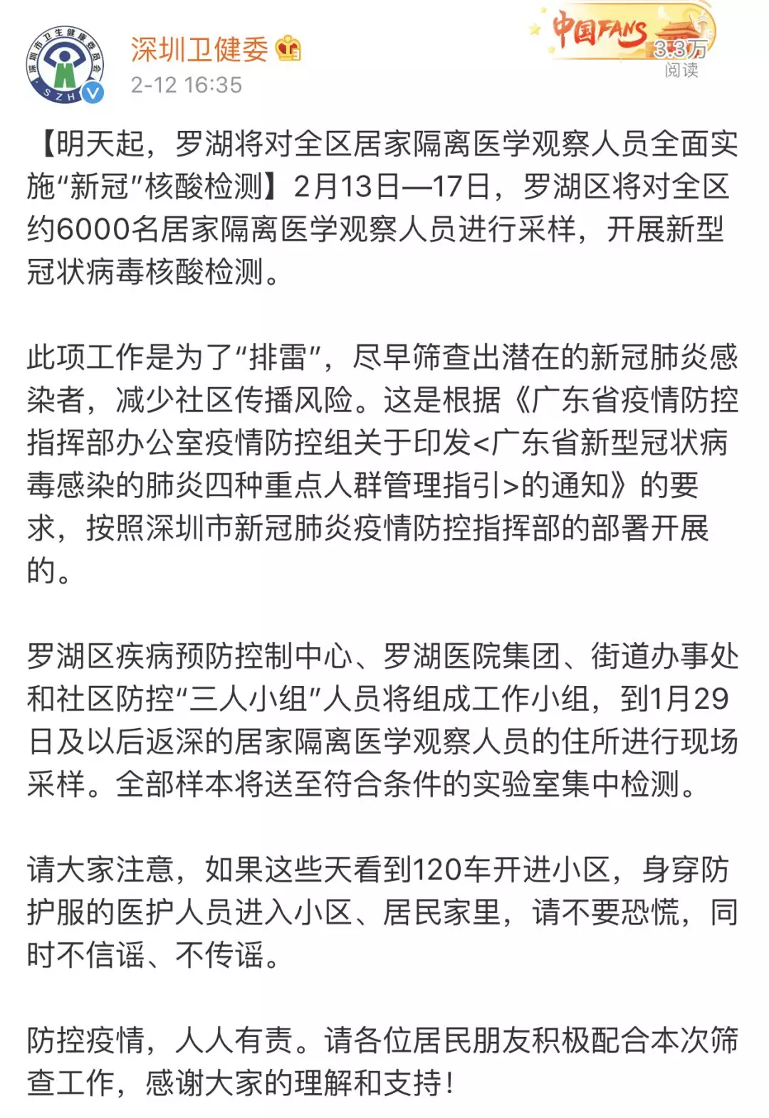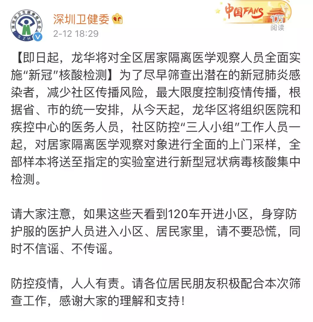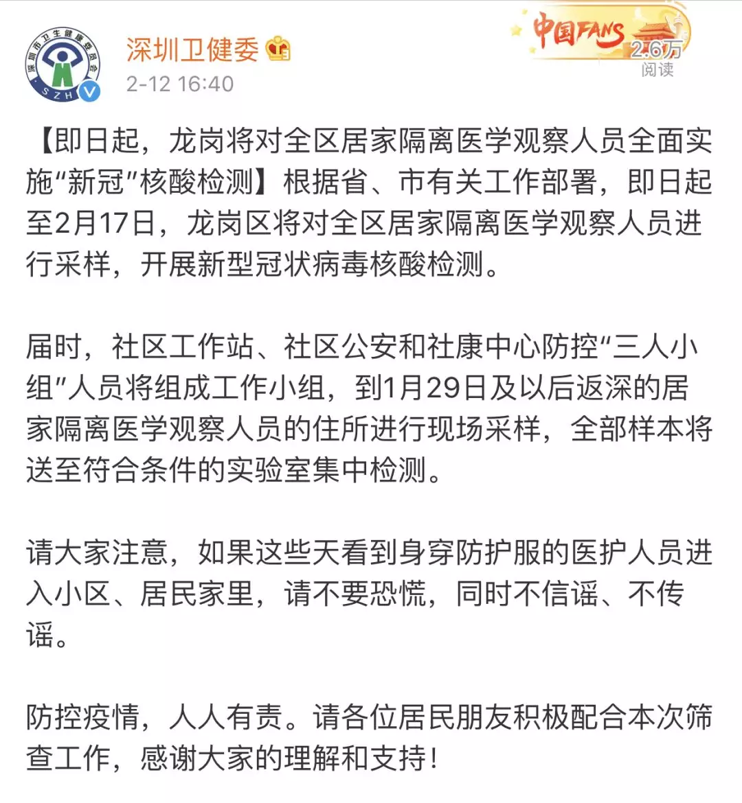 為防范新冠病毒感染疫情的社區(qū)傳播,切實(shí)做到早發(fā)現(xiàn)、早隔離、早診斷、早治療,2月12日起,深圳各區(qū)(新區(qū))均為所有居家隔離醫(yī)學(xué)觀察人員檢測(cè)新型冠狀病毒核酸。