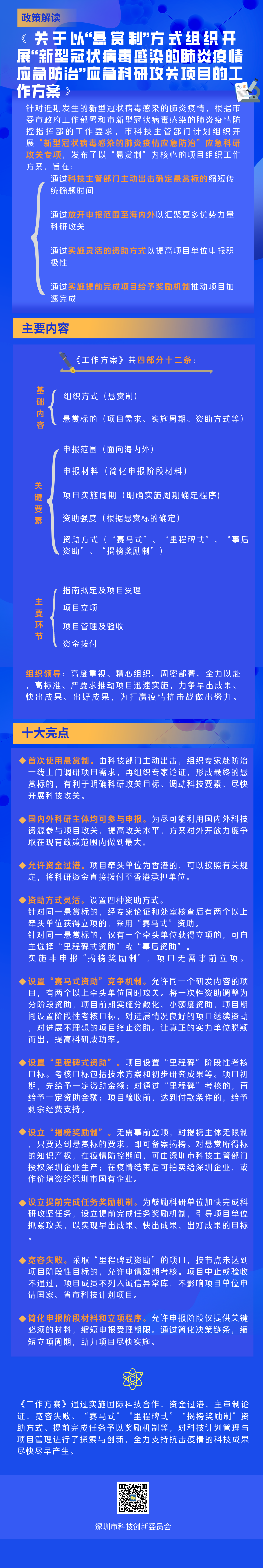 據(jù)悉,該方案首次使用懸賞制,由科技部門主動(dòng)出擊,組織專家赴防治一線上門調(diào)研項(xiàng)目需求,再組織專家論證,形成最終懸賞標(biāo)的。深圳市科創(chuàng)委相關(guān)負(fù)責(zé)人表示,以“懸賞”為方案核心有利于明確科研攻關(guān)目標(biāo)、調(diào)動(dòng)科技要素、盡快開展科技攻關(guān)。此外,為盡可能利用國(guó)內(nèi)外科技資源參與項(xiàng)目攻關(guān),提高攻關(guān)水平,方案對(duì)外開放力度爭(zhēng)取在現(xiàn)有政策范圍內(nèi)做到最大,國(guó)內(nèi)外科研主體均可參與申報(bào)。