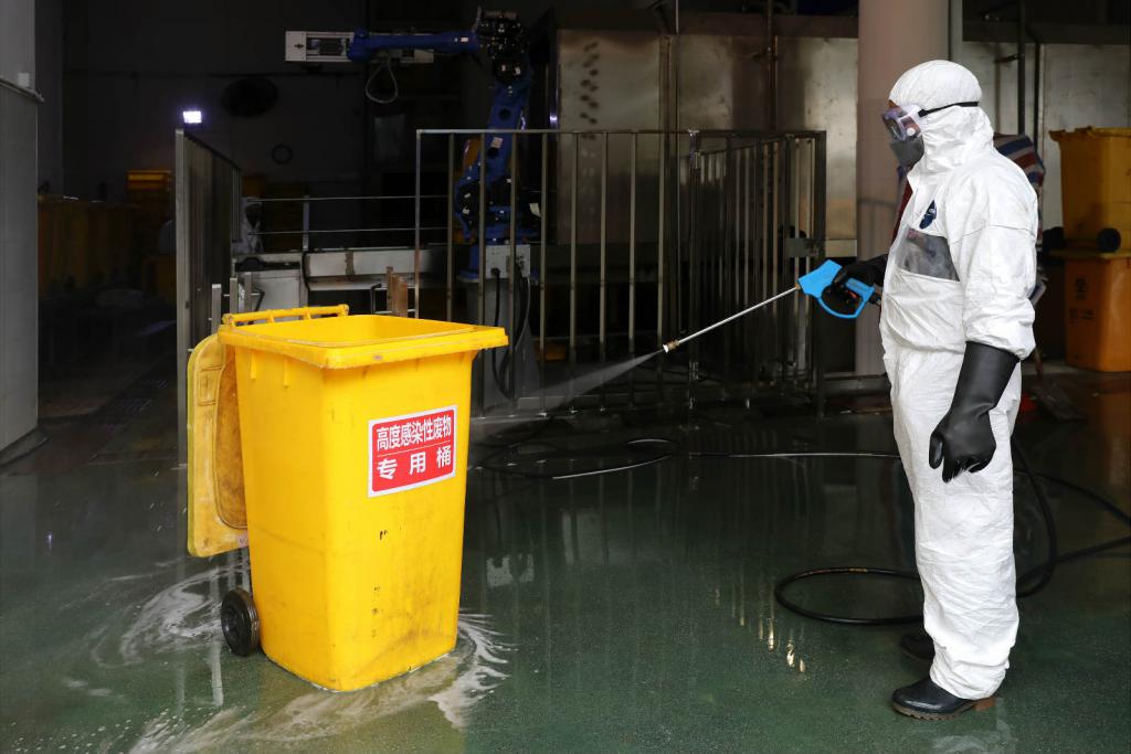 ▲卸完醫(yī)療廢物后,工作人員對卸料區(qū)域進行消毒。