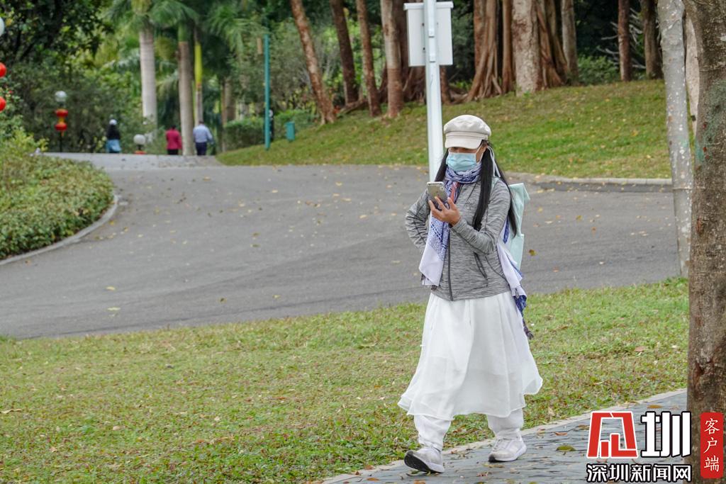 大姐邊散步邊通過手機視頻了解疫情資訊