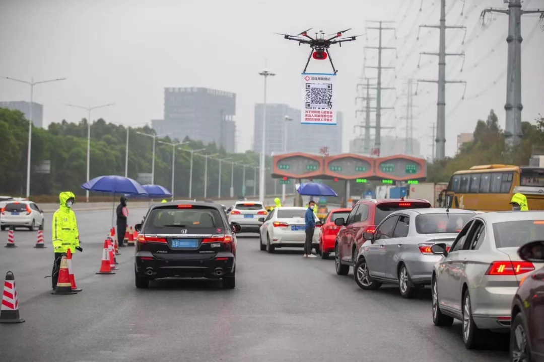 隨著返深車輛和人員的增加,深圳從8日開始啟用線上車輛申報登記。為提高申報效率,搭載喊話器、懸掛申報二維碼的無人機成為防疫一線工作人員的得力助手。民警操作無人機在車輛隊伍中穿梭,并通過喊話器提醒駕乘人員掃碼登記,減少人員接觸的同時提高了效率。