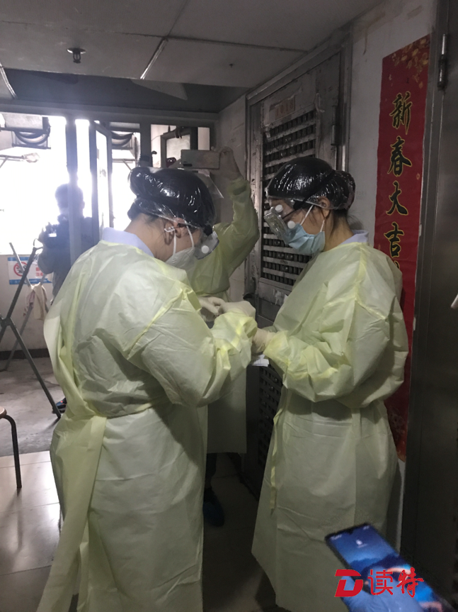 孫女士打開門,將工作人員遞進去的防護裝備穿戴完畢?!盀榱吮Wo醫(yī)護人員的安全,減少交叉感染的可能性,所有的上門檢測都會在樓道里進行?!鄙缈抵行墓ぷ魅藛T說。提前穿好防隔服等防護裝備、拿檢測時給居民坐的凳子、為凳子消毒,開始進行檢測前就需要做很細致的準(zhǔn)備工作。