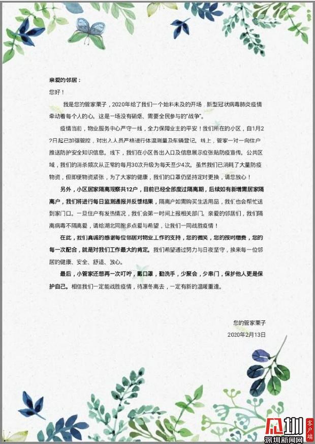 見圳客戶端·深圳新聞網(wǎng)2020年2月13日訊(見圳客戶端·深圳新聞網(wǎng)記者 潘潤華)“他們對疫情的恐懼并不少半分,可卻堅持在工作崗位。”“他們就是我們心目中的逆行者。守護著我們的安全?!苯?,一幕幕暖心畫面在深圳上演,不少業(yè)主紛紛踴躍為物業(yè)員工捐款,以表達對這些“平安守護者”“逆行人”的謝意。