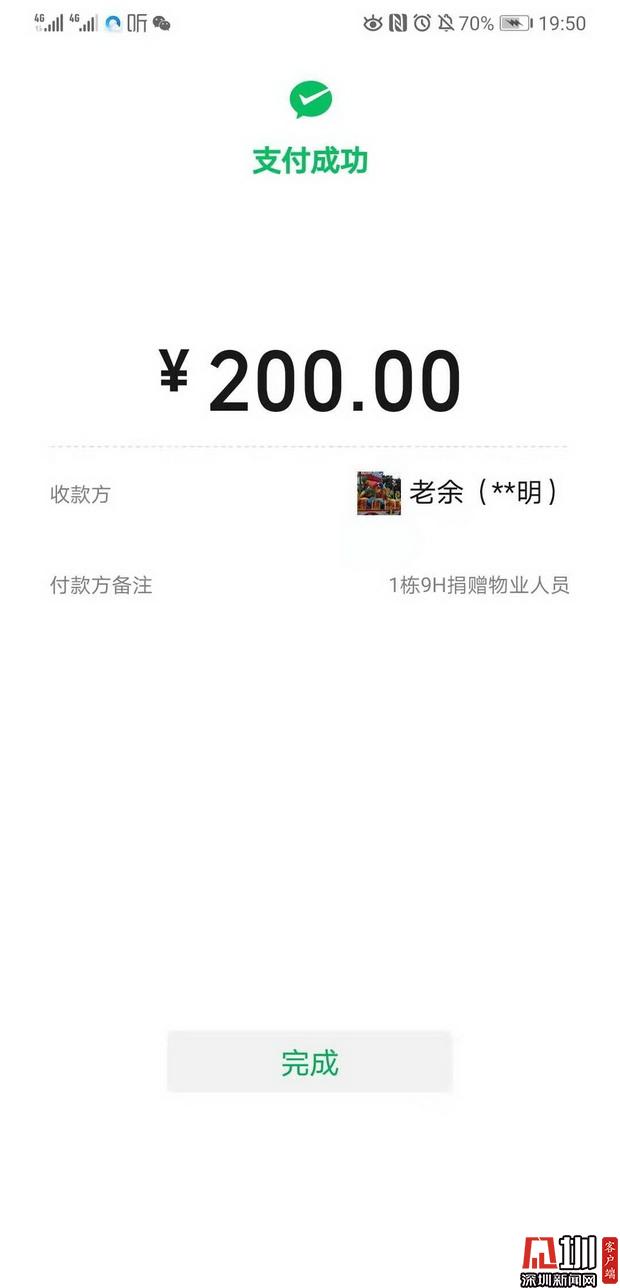 日前,深云村居民在微信群里討論小區(qū)防疫工作時,談到物業(yè)服務(wù)中心在防疫工作中投入大量人力物力,在防疫物資和人員不足的情況下加班加點地工作,有居民提議想對小區(qū)物業(yè)服務(wù)中心防疫一線的工作人員進行“打賞”,表達對他們的感激之情。深云村業(yè)委會聞訊后,迅速對這一提議進行了跟進討論,并于2月6日向小區(qū)居民發(fā)出《關(guān)于為深云村物業(yè)服務(wù)中心防疫一線員工打賞的倡議書》,呼吁小區(qū)居民以戶為單位通過手機掃碼的方式向特定賬戶“打賞”,得到居民的熱烈響應(yīng)。據(jù)了解,截至2月12日16:47,該小區(qū)居民共打賞982筆,總金額達119237.54元。