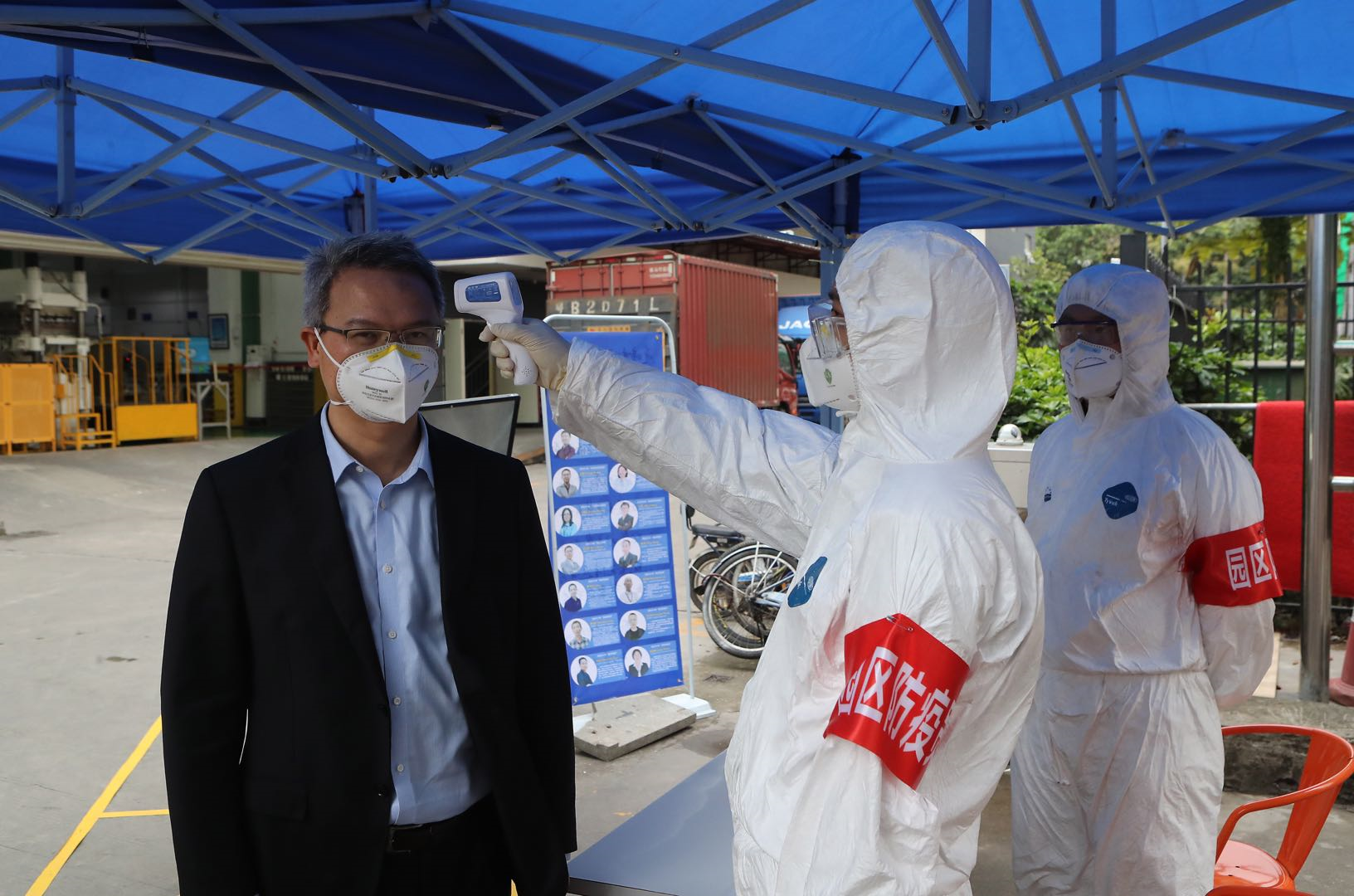記者驅(qū)車來到該公司園區(qū)門口時,就可以見到工作人員正在對進(jìn)入園區(qū)的車輛進(jìn)行消殺,在門口,還有多個海報上寫著進(jìn)入園區(qū)后的一些注意事項,例如在公司就餐的注意事項、自覺接受體溫測量和注意佩戴口罩等。
