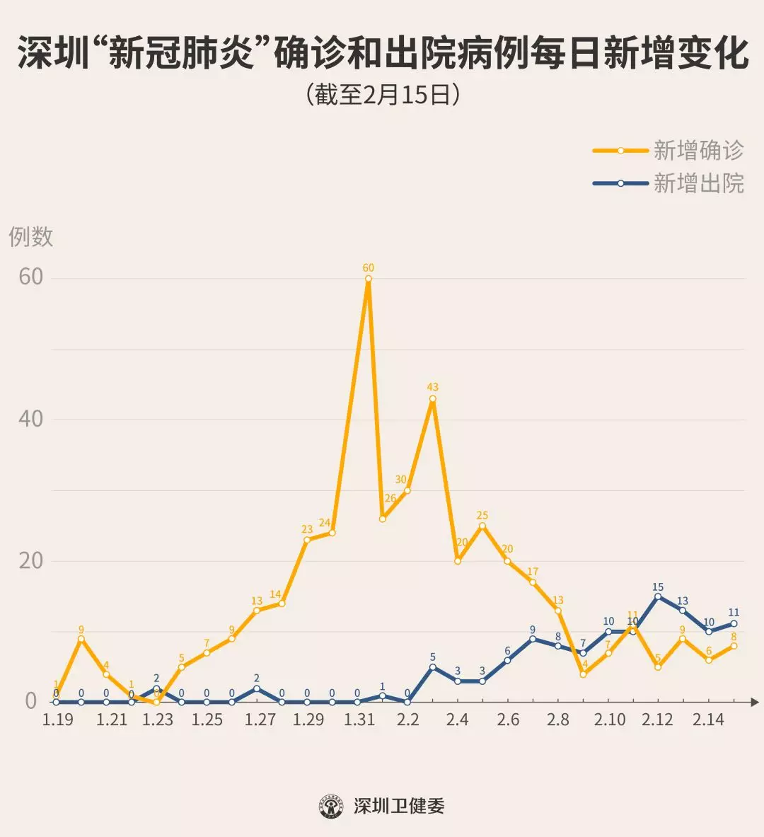 截至2月15日24時(shí),深圳累計(jì)報(bào)告“新冠肺炎”確診病例414例。2月15日當(dāng)天全市新增確診病例8例(個(gè)案詳情今晚公布)。 ▲新增出院病例已超過新增確診病例 累計(jì)報(bào)告確診病例中,男性195例、女性219例。 按照病例管理地區(qū)劃分,南山區(qū)87例、福田區(qū)78例、龍崗區(qū)71例、寶安區(qū)62例、龍華區(qū)34例、羅湖區(qū)32例、光明區(qū)11例、坪山區(qū)7例、鹽田區(qū)6例、大鵬新區(qū)2例、其他(指由機(jī)場(chǎng)、車站、碼頭、關(guān)口、路卡等直接送往定點(diǎn)醫(yī)院的)24例。 目前,重癥29例、危重癥9例,無死亡病例,累計(jì)出院115例。 299例確診病例均在深圳市第三人民醫(yī)院隔離治療。 541例密切接觸者正在接受醫(yī)學(xué)觀察。 資料來源:深圳市疾控中心、深圳市衛(wèi)健委、廣東省衛(wèi)健委