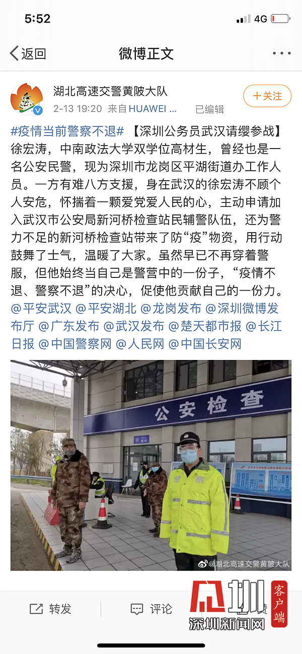 見圳客戶端、深圳新聞網(wǎng)2月16日訊(見圳客戶端、深圳新聞網(wǎng)記者 張凡 通訊員 李上彪 謝華庚)2月15日早上7點,來自深圳市龍崗區(qū)平湖街道的黨員徐宏濤就站在了武漢新河公安檢查站的崗位上,開始一天的志愿輔警工作。他是龍崗區(qū)平湖街道黨工委辦公室主任,因春節(jié)回家探親滯留武漢,這些天來,他懷揣著一顆愛黨愛人民的心,主動申請加入武漢市公安局新河檢查站民輔警隊伍,還為警力不足的檢查站帶來了防疫物資,他用行動回報這片生于斯長于斯的土地,更展現(xiàn)了一名龍崗優(yōu)秀黨員的擔(dān)當(dāng)與風(fēng)貌。