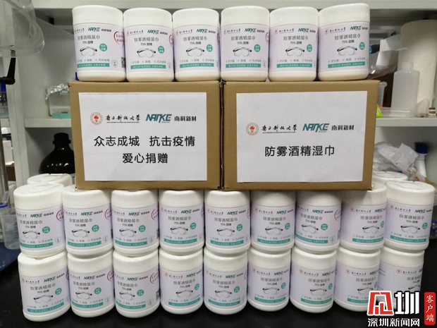 據(jù)悉,首批捐贈(zèng)的護(hù)目鏡防霧酒精濕巾數(shù)量為6000張(100桶)。該濕巾由孫大陟和南科大首屆畢業(yè)生張至共同發(fā)起創(chuàng)立的深圳南科新材科技有限公司和孫大陟課題組共同緊急研發(fā)趕制,簡(jiǎn)單擦拭后可保證護(hù)目鏡鏡片長(zhǎng)時(shí)間不起霧,對(duì)人體人眼無(wú)毒無(wú)害,且能起到有效消殺病菌作用。每片濕巾可至少擦拭一副護(hù)目鏡,防霧效果可至少持續(xù)一天,大大節(jié)省了醫(yī)護(hù)人員清潔裝備的時(shí)間,為爭(zhēng)分奪秒抗擊疫情提供了有利條件。