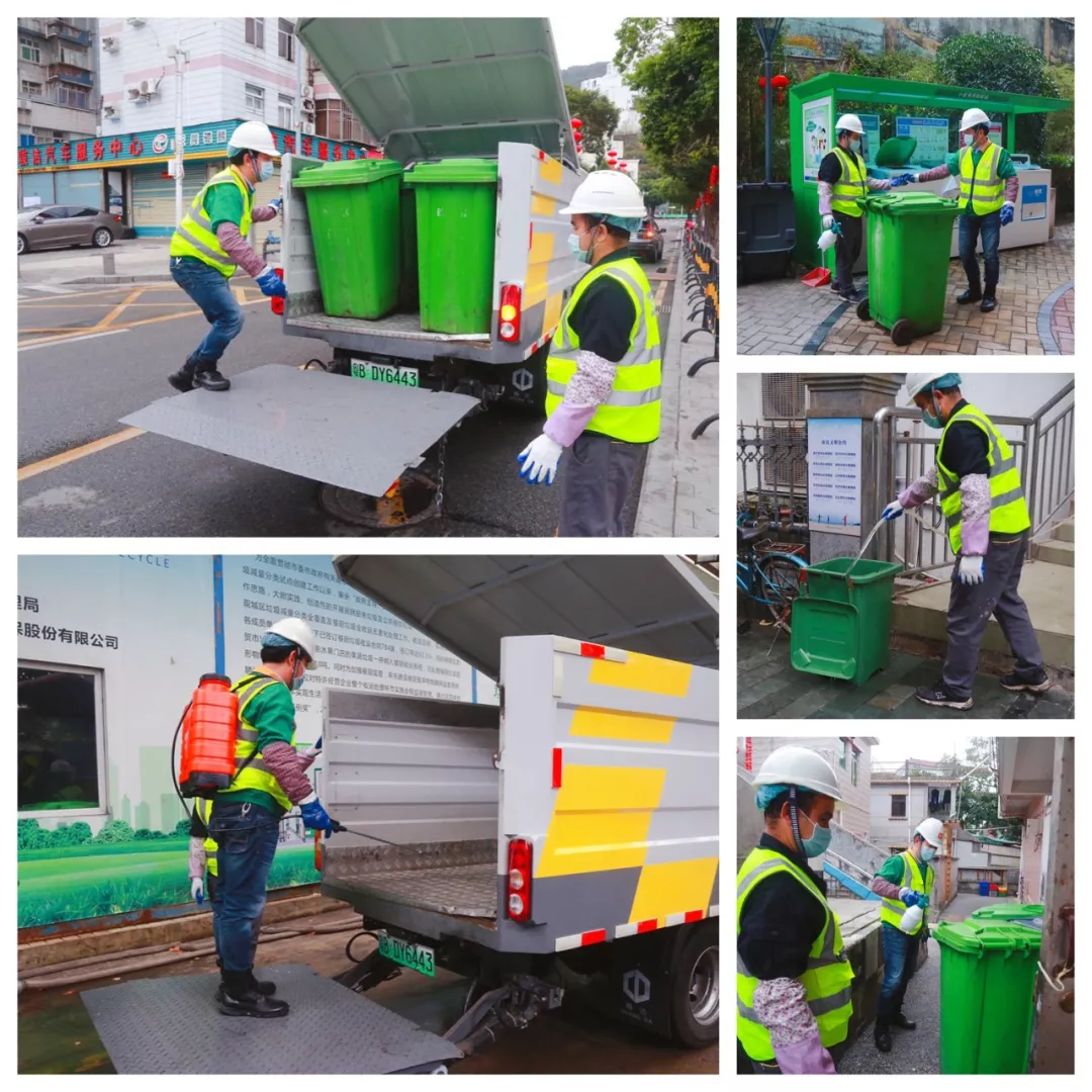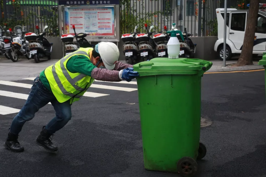 上午7點(diǎn)半,第一個(gè)到崗的田夫珍開始測(cè)量體溫,消毒后穿上印有“深能環(huán)?!钡鸟R甲,戴上安全帽,檢查車輛消殺情況。8點(diǎn)整,他和14名同事一起出發(fā),分赴鹽田7條線路,開始和餐廚垃圾打交道。