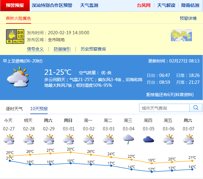27日多云,早晨有輕霧,氣溫18-25℃,沿海及高地最大陣風(fēng)6-7級(jí);28日至3月3日多云為主,氣溫小幅波動(dòng),早晚有輕霧,偶有零星小雨;4日冷空氣影響,北風(fēng)加大,有小雨,氣溫明顯下降。森林火險(xiǎn)黃色預(yù)警持續(xù)生效中,請(qǐng)注意家庭用火、用電安全。