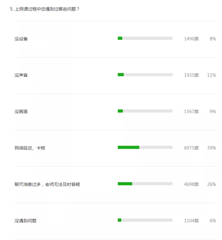 此外,22%的參與者認(rèn)為,網(wǎng)課缺乏教學(xué)氛圍,無法真正實(shí)現(xiàn)互動(dòng)式在線課堂。有家長認(rèn)為,目前老師用群進(jìn)行講解,聊天消息過多,信息雜亂,老師無法及時(shí)答疑,建議老師通過小視頻等形式將熱點(diǎn)問題再進(jìn)行補(bǔ)充講解。