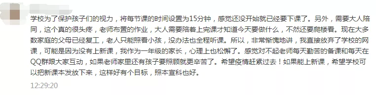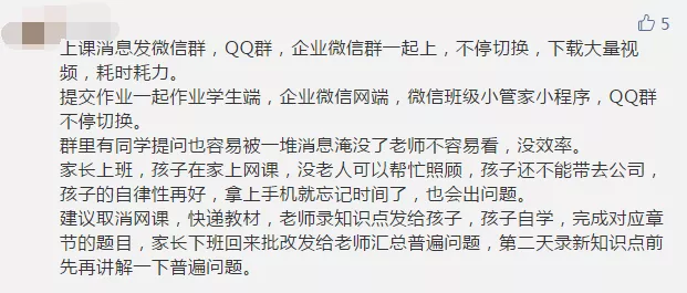 一位小學(xué)老師也直言:線上授課效果太差了,寧愿犧牲周末或暑假時(shí)間上課。