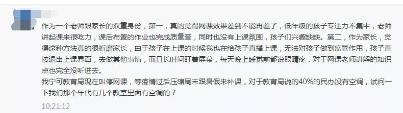 有家長表示,如果遇上網(wǎng)絡(luò)卡頓,很容易跟不上老師講課的節(jié)奏。還有家長表示曾出現(xiàn)過因為網(wǎng)絡(luò)太卡,有時候設(shè)備剛弄好,課程就已經(jīng)結(jié)束了的情況。