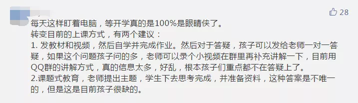 此外,22%的參與者認為,網(wǎng)課缺乏教學氛圍,無法真正實現(xiàn)互動式在線課堂。有家長認為,目前老師用群進行講解,聊天消息過多,信息雜亂,老師無法及時答疑,建議老師通過小視頻等形式將熱點問題再進行補充講解。