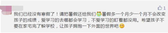 不過(guò),也有31%的參與者投了反對(duì)票。有些網(wǎng)友呼吁:寒假已經(jīng)沒(méi)有了,希望暑假可以保留,讓孩子擁抱外面的世界。