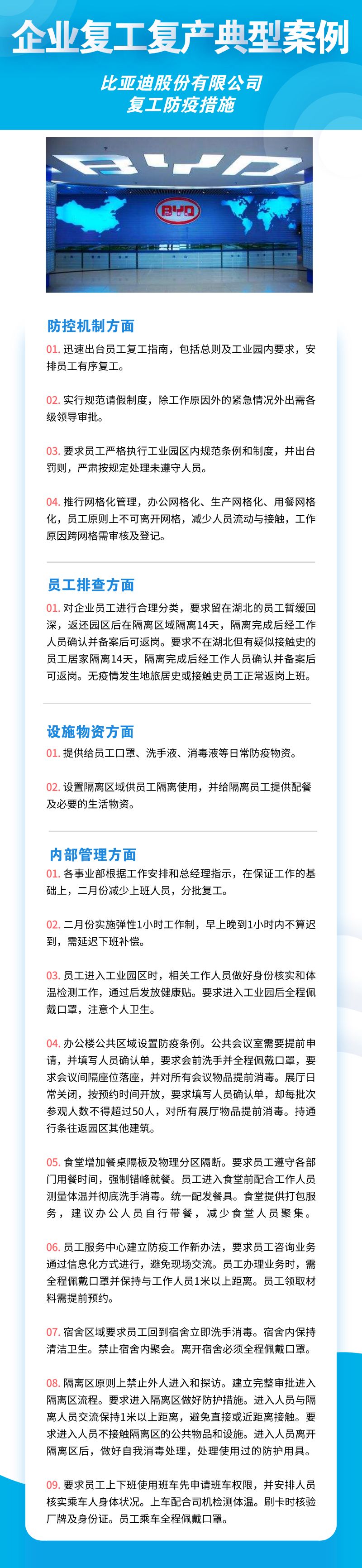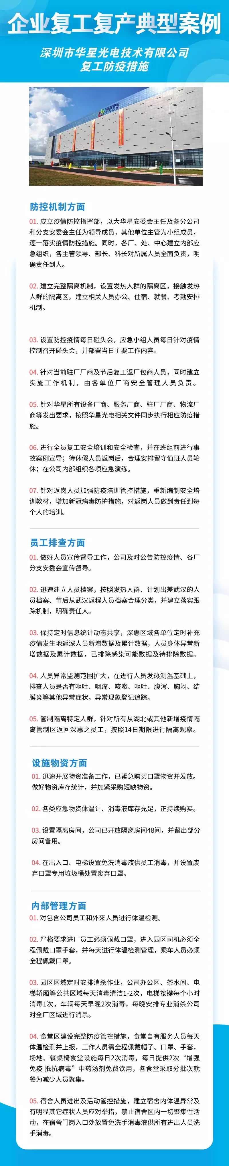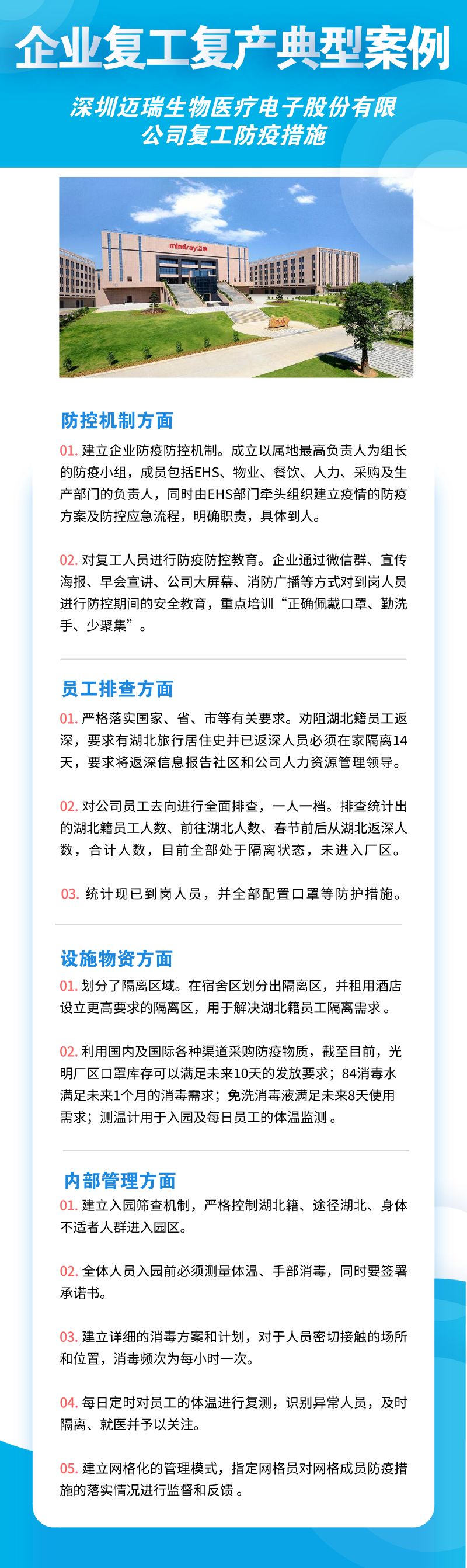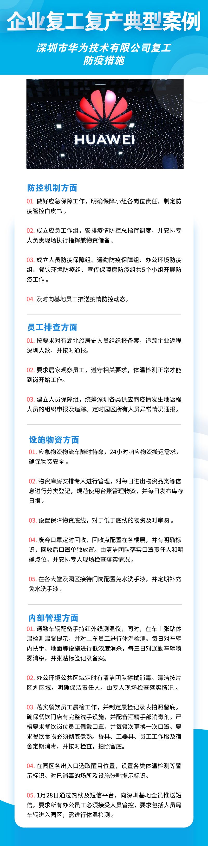 深圳市華為技術(shù)有限公司、聯(lián)想系統(tǒng)集成(深圳)有限公司、深南電路股份有限公司、比亞迪股份有限公司、創(chuàng)維集團(tuán)股份有限公司等8家公司,從防控機(jī)制、員工排查、設(shè)施物資、內(nèi)部管理四個(gè)方面來落實(shí)疫情防控措施,包括成立企業(yè)疫情防控小組、建立企業(yè)防控機(jī)制、提升員工防控意識(shí)、劃分隔離區(qū)域、宿舍食堂等區(qū)域消殺等舉措。